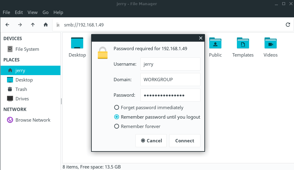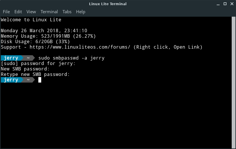 sudo smbpasswd -a name...where name is your Linux Lite username; in our case the username is jerry. For easily remembering the SMB password, you can use the same password for SMB as that in your Linux Lite user account if you wish.