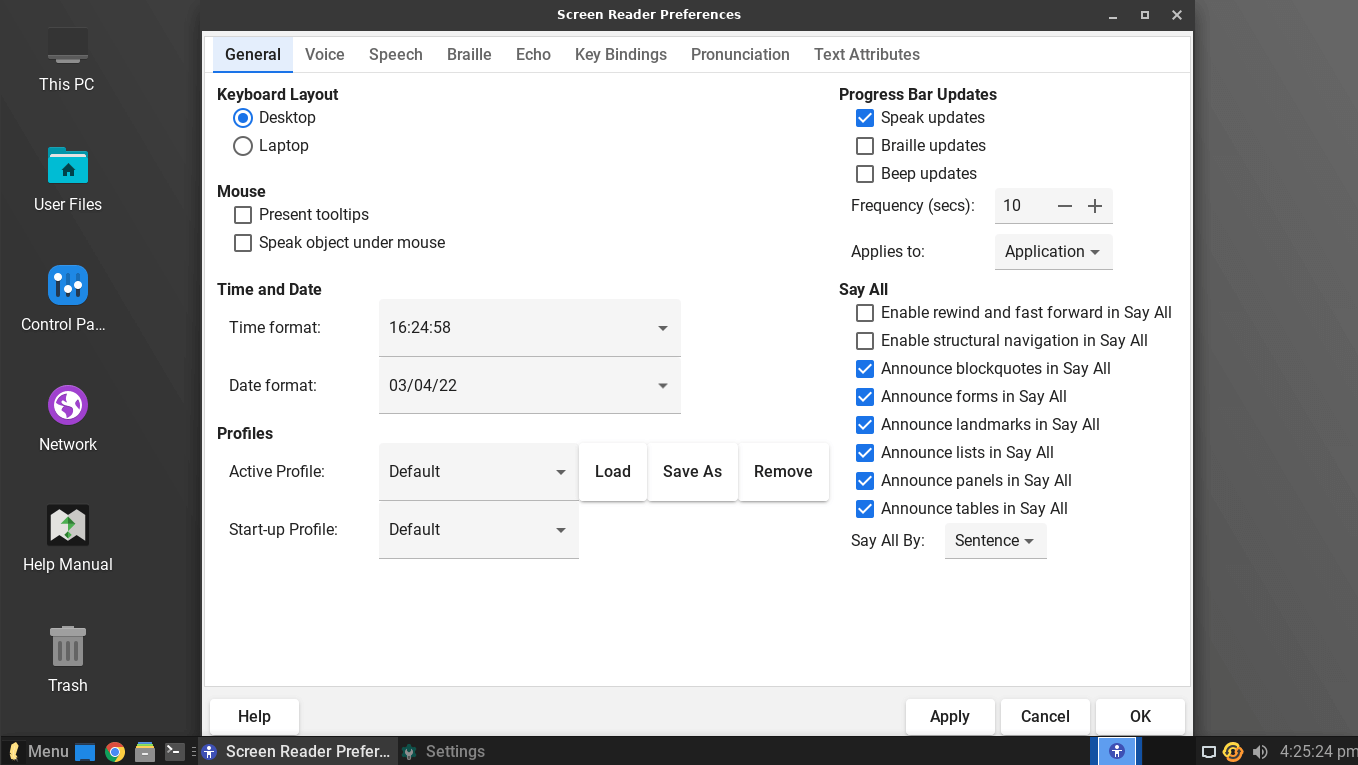 Here you can set up your screen reader to your own requirements. Orca is highly configurable so you should have no trouble setting it up to your personal requirements.
