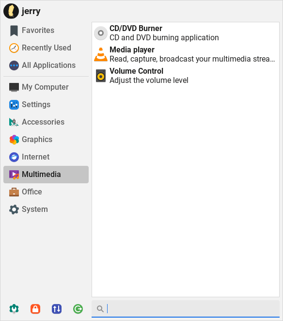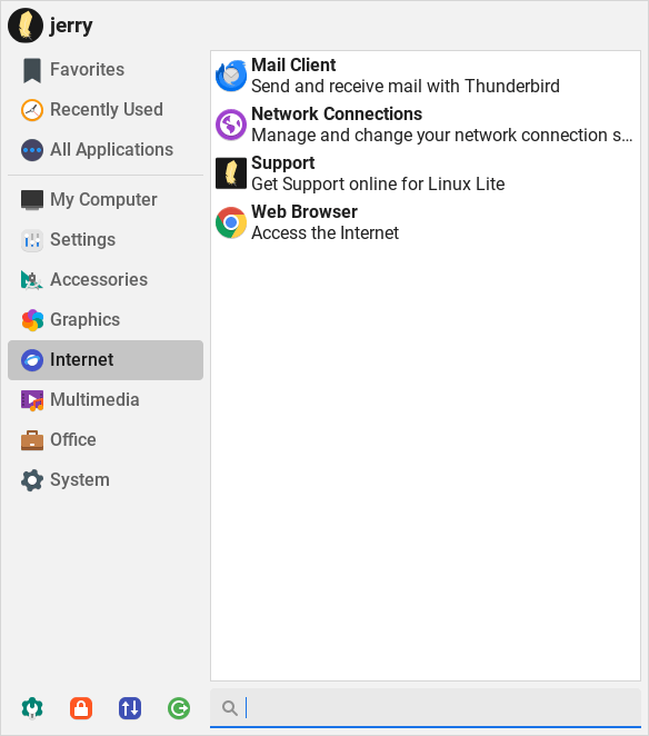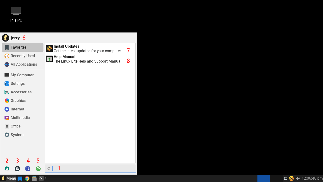 1 - Menu. This is where all of your applications are accessed. In Linux Lite, Menu items are categorized. See here for more information.