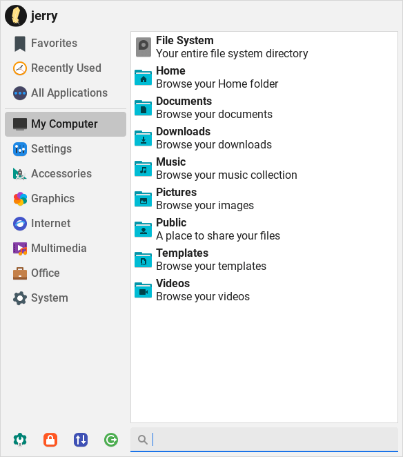 Conveniently placed shortcuts to your file system and all the folders within your home directory (English installations only).