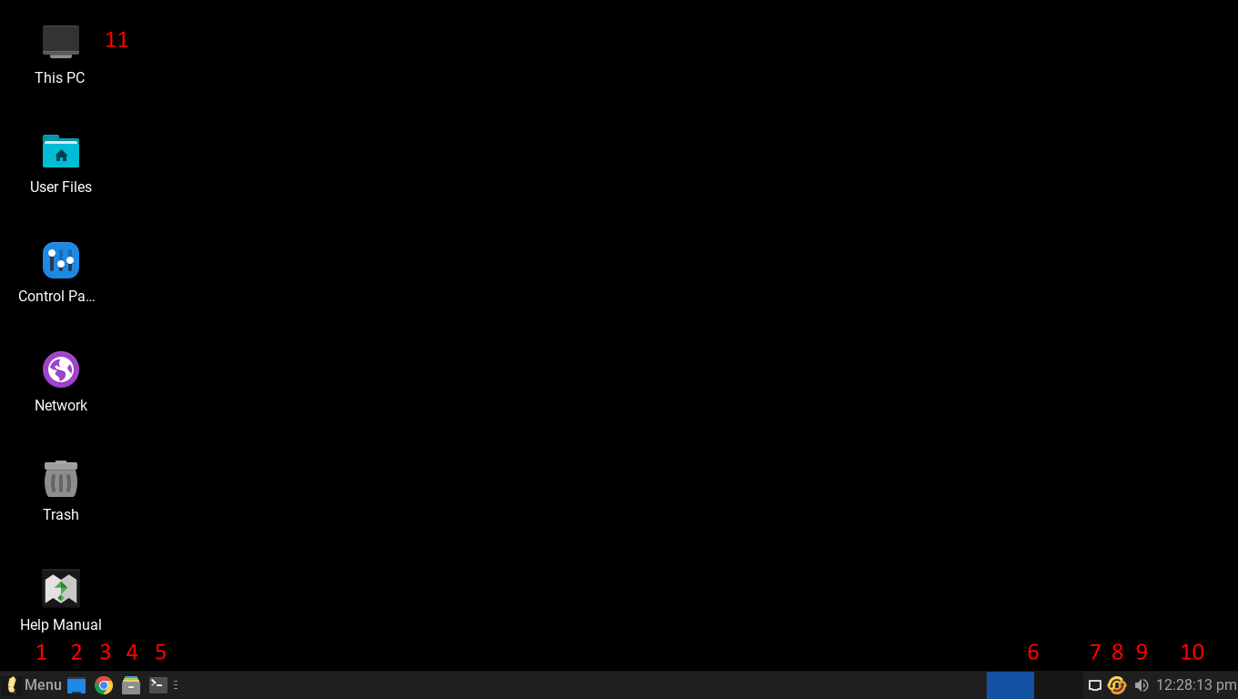 1 - 10 - Taskbar. This area consists of the Menu, quick launch application icons, workspaces and the system tray.