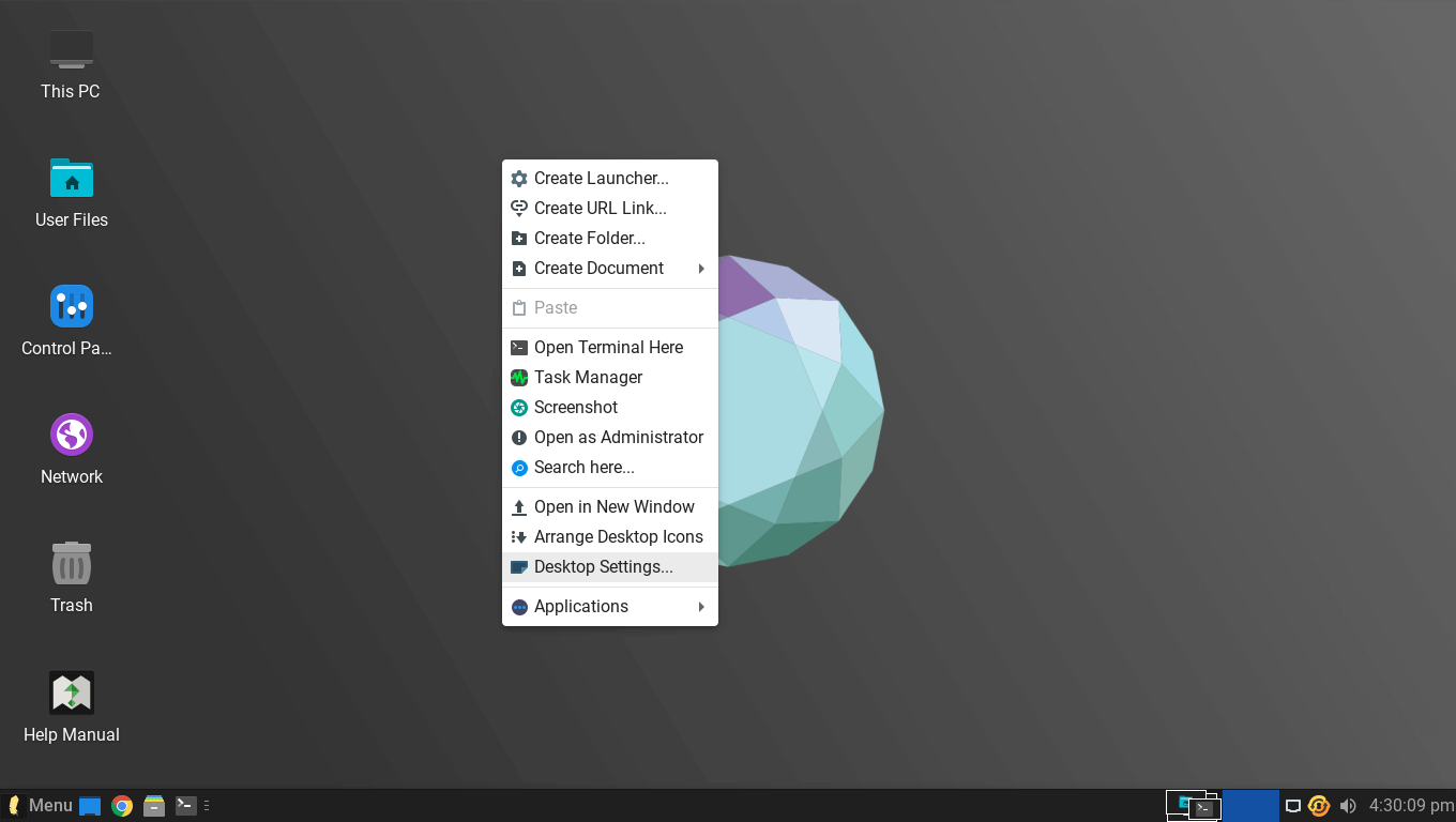 When you right click on a clear space on the Desktop, you will get a menu of utilities to select from. To change the Wallpaper, select Desktop Settings from the menu.